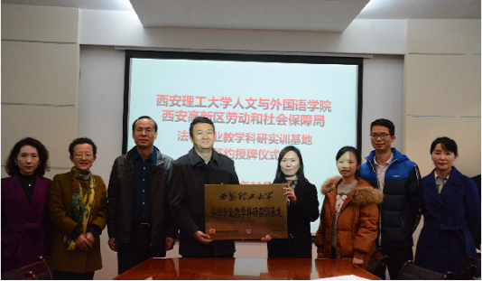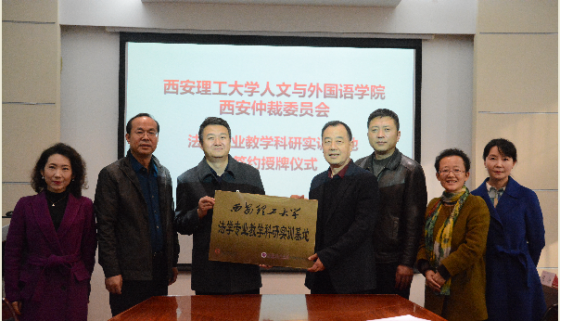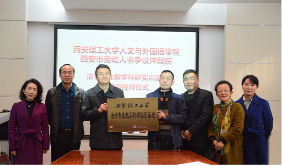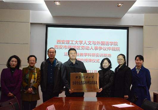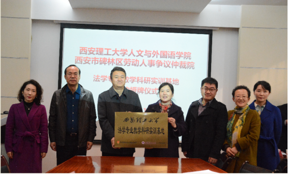 2018年11月26日下午,西安理工大学人文与外国语学院与西安仲裁委员会、西安市劳动人事争议仲裁院、西安市碑林区劳动人事争议仲裁院、西安市雁塔区劳动人事争议仲裁院、西安高新区劳动与社会保障局等五家单位,本着“资源共享、优势互补、共同发展”的原则,在西安理工大学人文与外国语学院教十一楼201会议室成功举办法学专业教学科研实训基地签约授牌仪式。