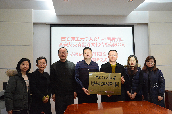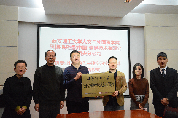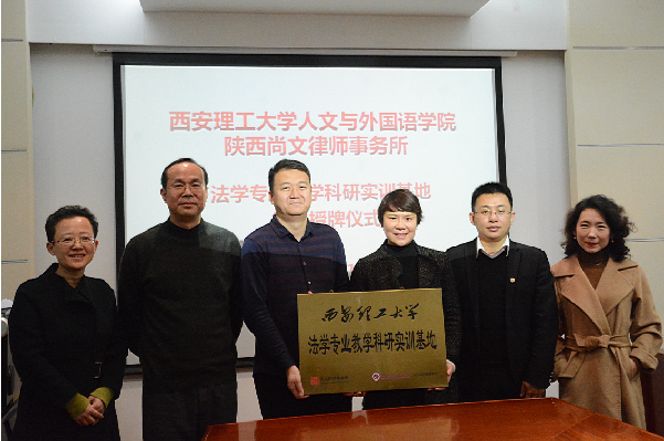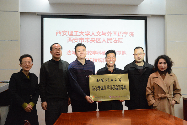 2018年12月17日下午,西安理工大学人文与外国语学院与西安市未央区人民法院、陕西尚文律师事务所、西安艾克森翻译文化传播有限公司、恩梯梯数据(中国)信息技术有限公司西安分公司等四家单位,本着“资源共享、优势互补、共同发展”的原则,在西安理工大学人文与外国语学院教十一楼201会议室成功举办教学科研实训基地签约授牌仪式。