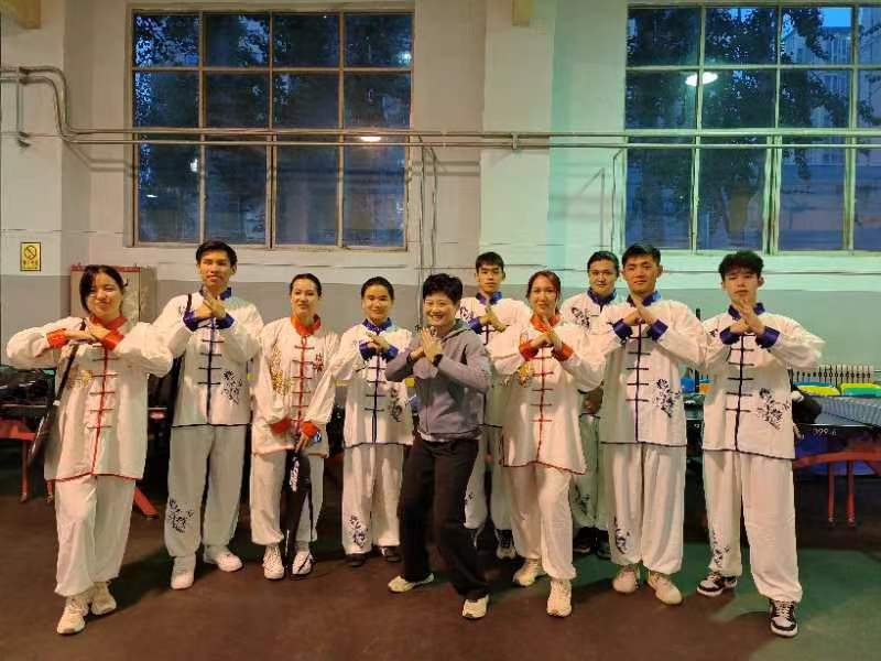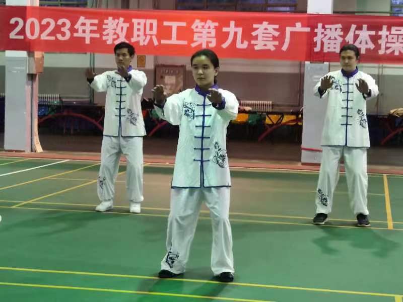 这一队伍是来自人文与外国语学院2022级中亚预科班的学生。太极拳是他们学习中国文化、体验传统文化魅力的重要课程,也是知华友华爱华的生动窗口。为带领中亚学生深刻领会中华传统体育项目的文化魅力,国际中文教育团队艾军老师与体育部董峰主任合作,制定了理论与实践相结合的教学和表演计划。由班主任王春霞老师在《中国概况》课程中介绍中国传统体育项目的类型和现代体育发展状况,由姚婧老师解说太极拳背后深刻的文化内涵,并教授和训练。学生有机会接触神秘的“中国功夫”,兴趣高昂,学习和训练刻苦认真,一个多月时间,已经初有所成。为展示教学成果,也为了继续激励学生努力学习中国文化的热情,人文与外国语学院与体育部通力合作、精心策划,许小桃、王春霞、杨琳三位老师带队,在教职工第九套广播体操比赛中场休息时正式登台亮相、汇报演出。