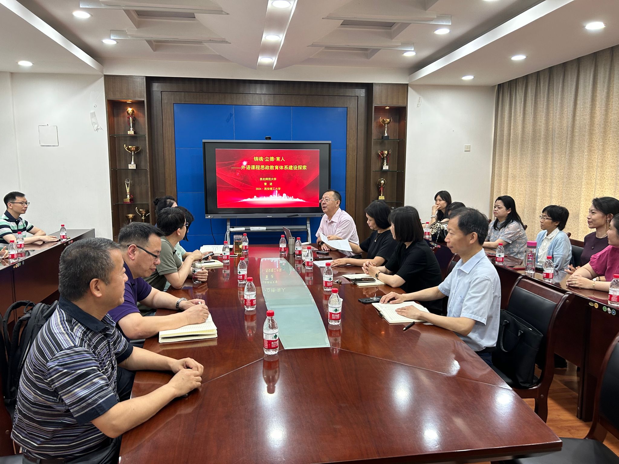 2024年6月7日,人文与外国语学院邀请西北师范大学国别与区域研究院常务副院长、中亚研究院副院长曹进开展了“铸魂·立德·育人——外语课程思政教育体系建设探索”专题讲座。讲座由院长张洁主持。来自英语系、日语系、中文系、外语教学部教师到场聆听。