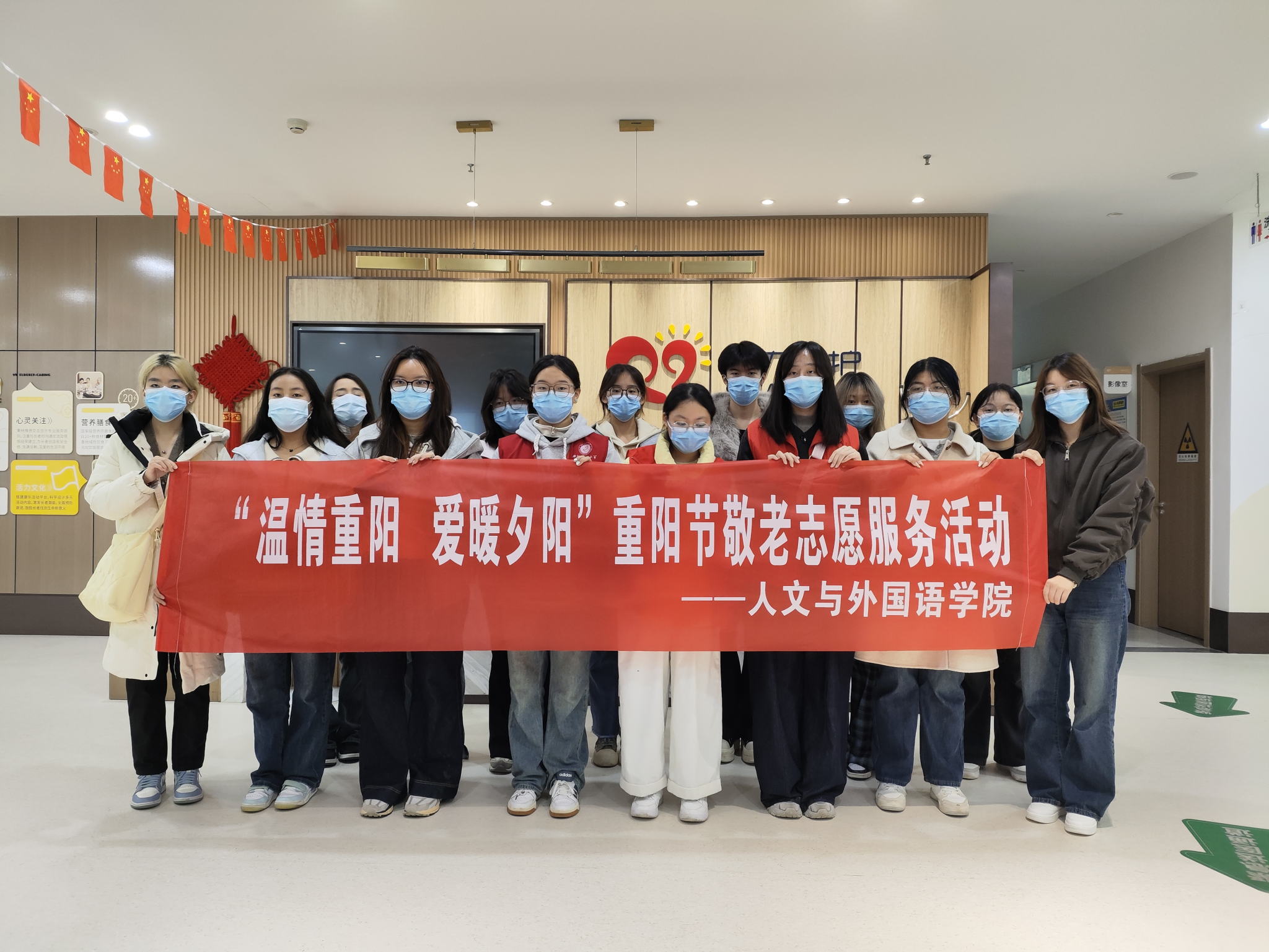 在重阳节来临之际,为弘扬中华民族敬老爱老的优良传统,增强青年学生的社会责任感,10月25日,人文与外国语学院青年志愿者协会组织二十余名志愿者前往九九照护•养老康复医疗中心,开展了以“温情重阳 爱暖夕阳”为主题的敬老志愿服务活动。
