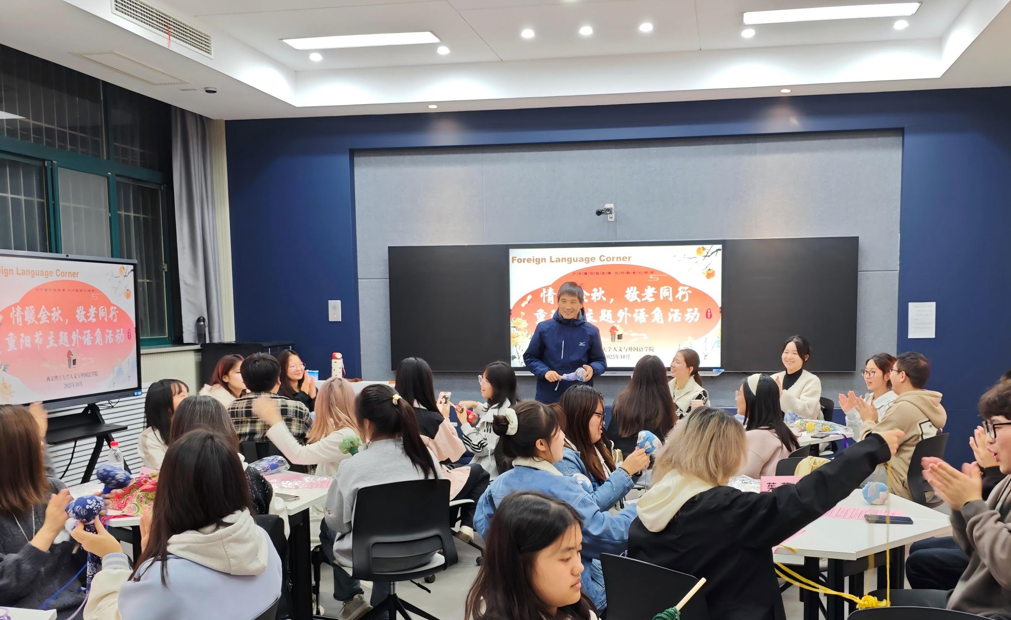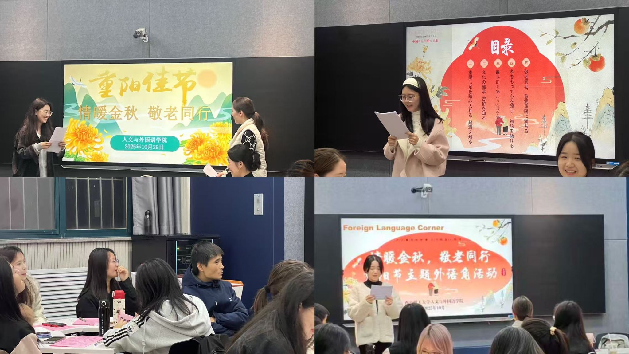 为进一步弘扬中华民族尊老敬老的传统美德,推动跨文化交流与语言实践融合,10月29日晚19时,人文与外国语学院在教8楼105教室举办“情暖金秋 敬老同行”重阳节主题外语角活动。日语系教师胡新祥与40余名本科生、研究生共同参与。