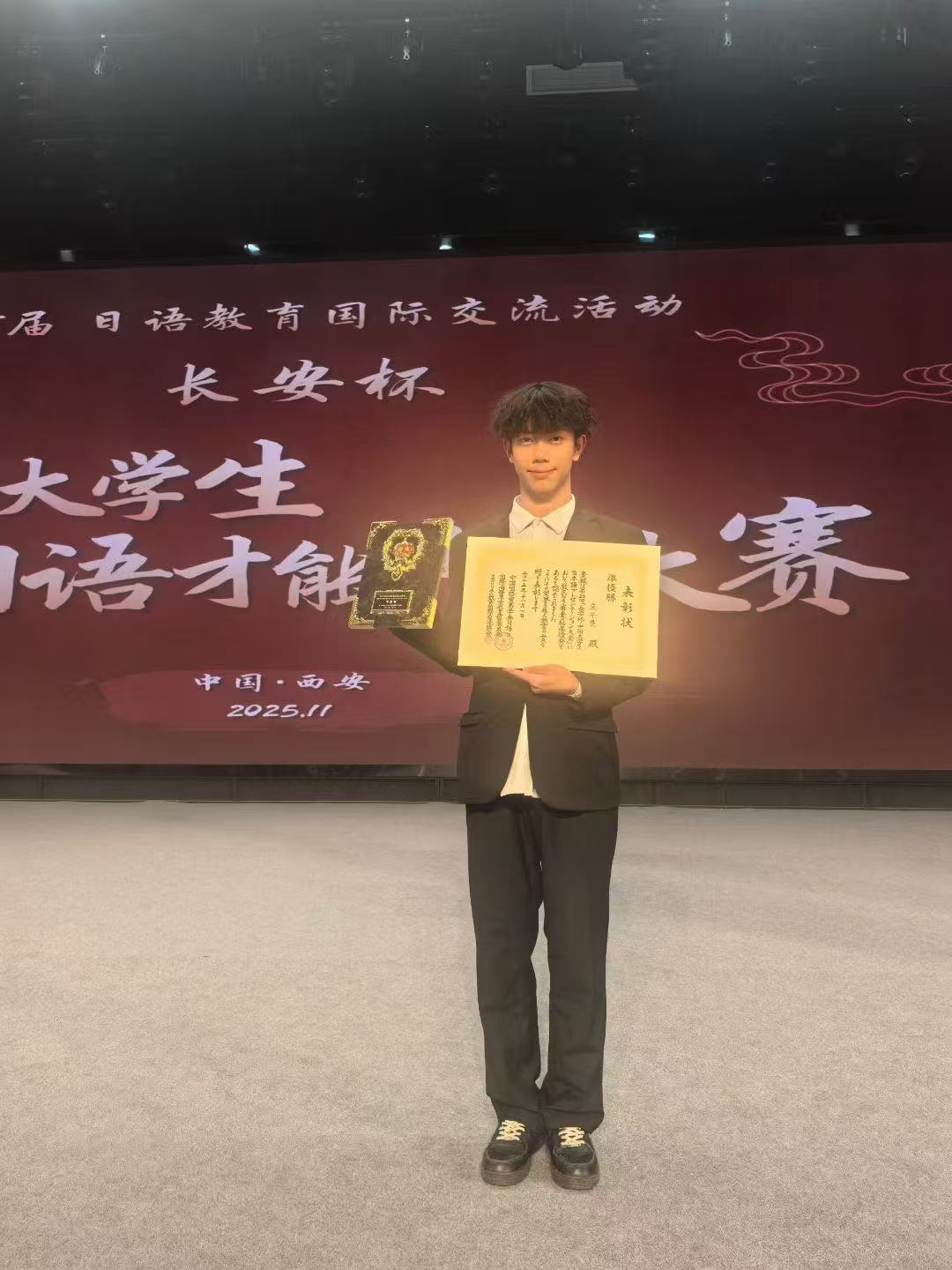 比赛设有命题作文与主题演讲两个环节,旨在考察选手的语言应用能力、逻辑思维与跨文化表达水平。我校2024级日语专业学生袁子昊同学凭借扎实的语言功底与富有感染力的演讲,荣获陕西高校组二等奖的佳绩。指导教师为日语系铃木雅子老师和唐楠老师。