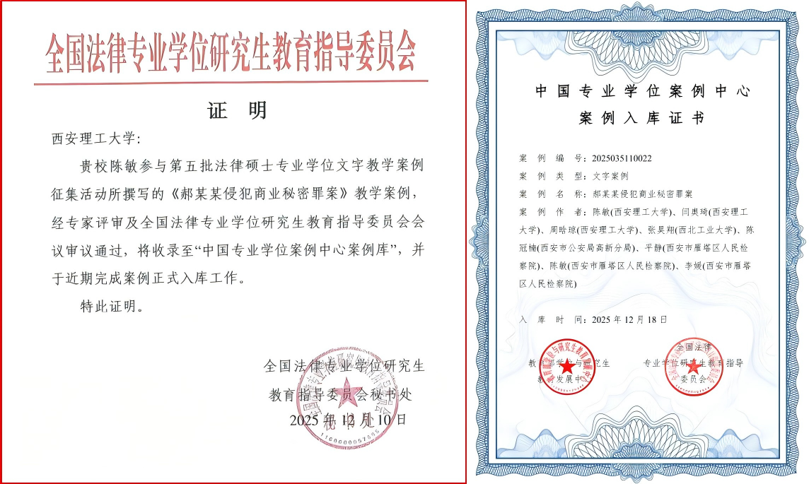 第五批法律硕士专业学位案例征集主题范围涉及民事法律实务、行政法律实务、刑事法律实务、非诉讼法律实务和涉外法治实务(原国际法律实务)五个领域。本次入选的案例聚焦“刑事法律实务”,案例内容为市场经济核心领域的商业秘密保护问题,紧密对接企业创新发展与法治建设的现实需求,深入剖析了商业秘密的认定标准、侵权行为界定、刑事追责边界等核心法律议题,既具备理论研究的深度,又兼具司法实践的指导价值,为法律硕士研究生理解经济犯罪领域的司法实务难点提供了典型范本。作为教育部学位与研究生教育发展中心设立的国家级平台,“中国专业学位案例中心案例库”的收录情况是高校专业学位教育质量的核心衡量标准,在学科评估与授权审核中发挥着关键作用。此次我校案例成功入选,不仅是全国法律专业学位研究生教育指导委员会对我校法律专业学位研究生培养质量的权威认可,更标志着我校法学专业和法律硕士学科在案例教学与法治实践融合方面迈出了坚实步伐,凸显我校在高层次法律人才培养中的特色优势与优势。