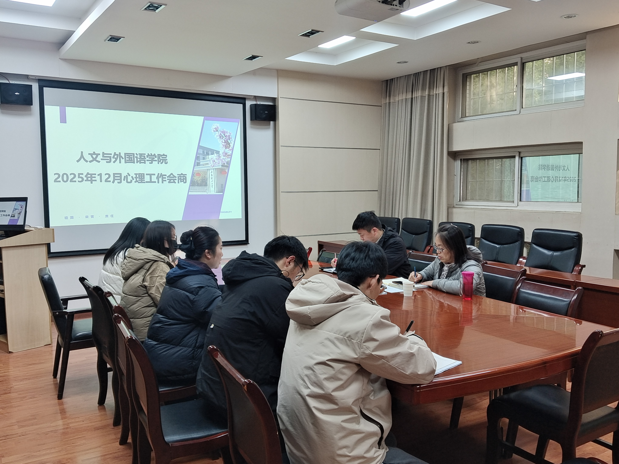 为进一步落实学期末学生安全稳定工作,筑牢学生心理健康防线,人文与外国语学院于12月24日组织召开12月心理健康工作会商。学校心理健康教育中心刘娟娟老师受邀参会指导,学院党委副书记赵玉强,全体辅导员参加会议。