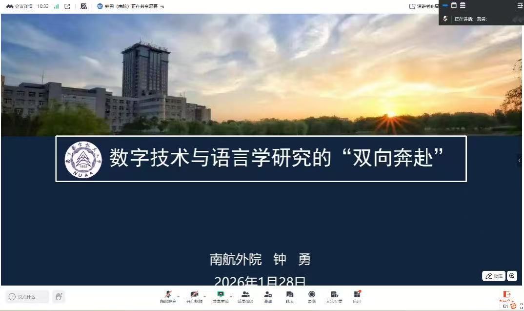 2026年1月28日,人文与外国语学院举办了主题为“数字技术与语言研究的‘双向奔赴’”的线上学术沙龙。本次学术沙龙特邀南京航空航天大学外国语学院钟勇老师担任主讲,线上为学院师生带来了一场内容丰富、视角前沿的学术分享,学院一百三十多名师生参加了本次学术活动,学院副院长黄勇主持会议。