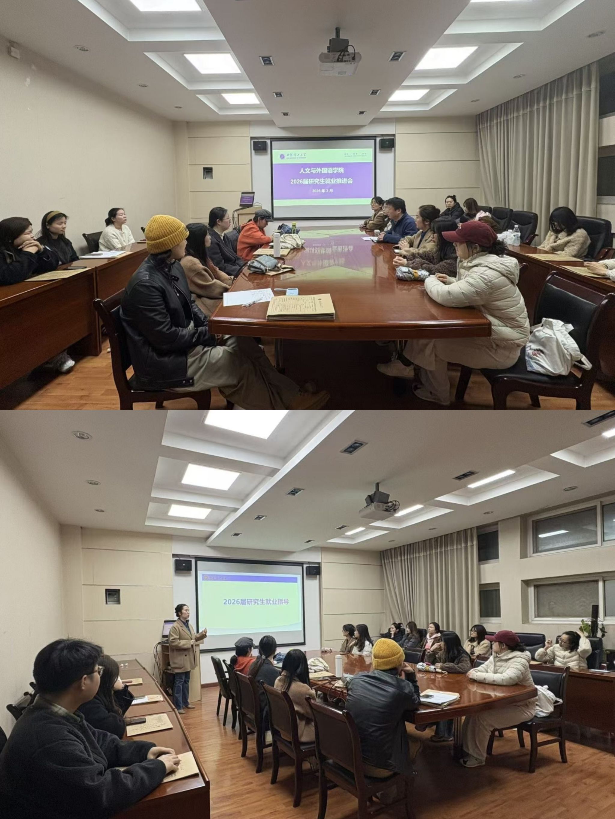 为进一步推进2026届研究生就业工作,人文与外国语学院于2026年3月12日在教11-201会议室召开2026届研究生就业推进会。会议由学工办主任孟雅莉主持,学院党委副书记赵玉强,研究生辅导员,2026届研究生参加了本次会议。